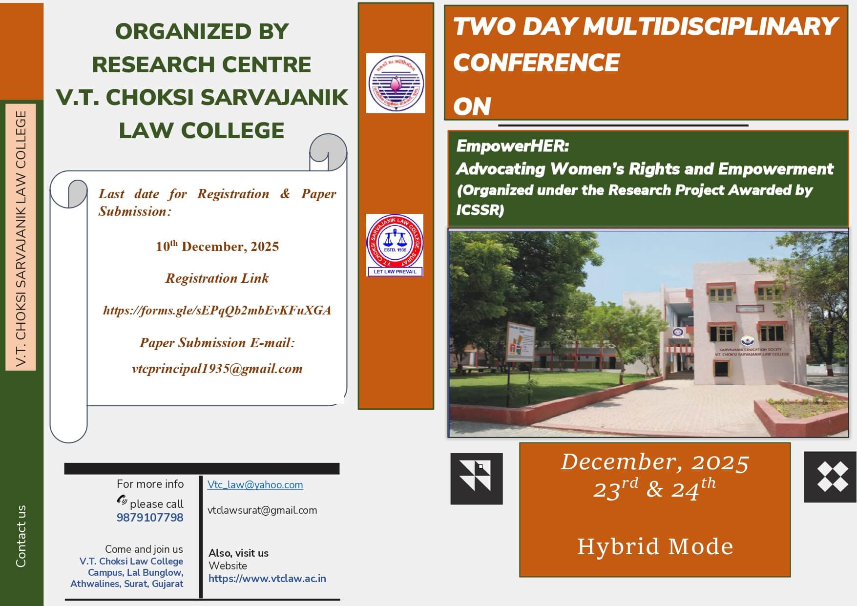 V.T Choksi Sarvajanik Law College’s vision is to impart – ‘justice oriented legal education’ and its mission is to evolve as ‘A center of excellence in areas of teaching, research, and capacity building and community